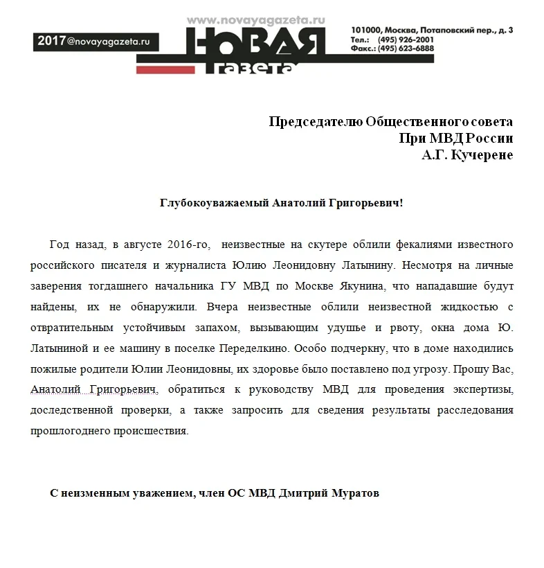 Обращение главного редактора «Новой» по поводу расследования нападения на обозревателя Юлию Латынину