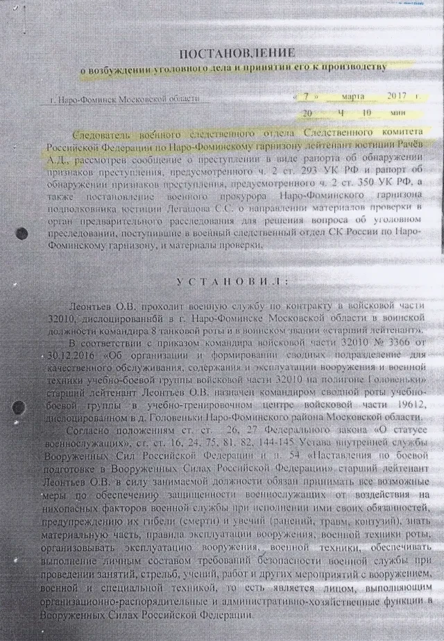 Однако в редакции «Новой» имеется копия постановления о возбуждении уголовного дела № 1.17.0200.3307.000017 от 7 марта 2017 года в отношении Леонтьева О.В. Военный следователь указывает, что «за рядовым Горбуновым по состоянию на 6 февраля 2017 года танк Т-80У, бортовой номер 436, не закреплялся, обучение работе на данном образце технике рядовым Горбуновым завершено не было, достаточных практических навыков управления танком он не имел, экзамен (зачет) на допуск к самостоятельной работе на названном образце ВВТ им не сдавался, удостоверение механика-водителя установленным порядком ему не выдавалось. <…> Рядовой Горбунов И.А. не мог быть допущен к самостоятельному управлению танком Т-80У. <…> Старший лейтенант Леонтьев, будучи осведомленным об отсутствии у рядового Горбунова достаточных практических навыков самостоятельного управления танком и выданного <…> удостоверения механика-водителя, отдал тому устный приказ осуществить управление танком <…>, в состав экипажа которого Горбунов включен не был».