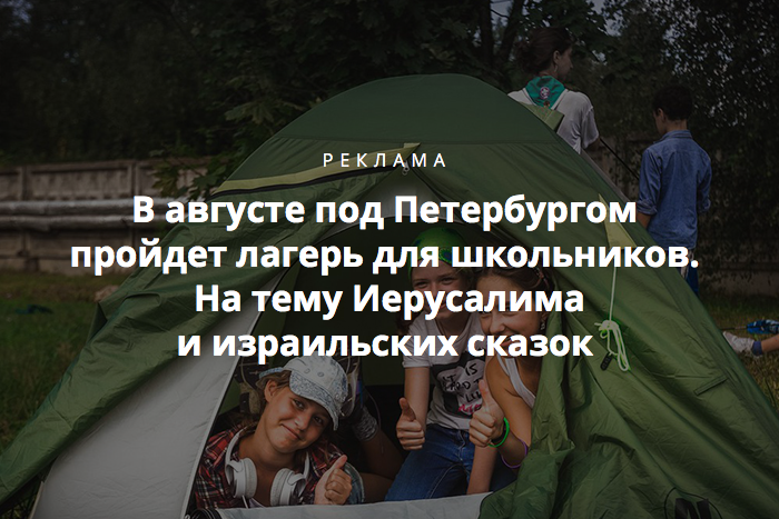 В августе в пансионате под Петербургом откроется летний лагерь «Иерусалим, или как я полюбил сказки». Он рассчитан на школьников с 11 до 17 лет. Для них будут организовывать вечера у костра, ночевки в палатках, полевую кухню, а также устроят знакомство со скаутами из Израиля.