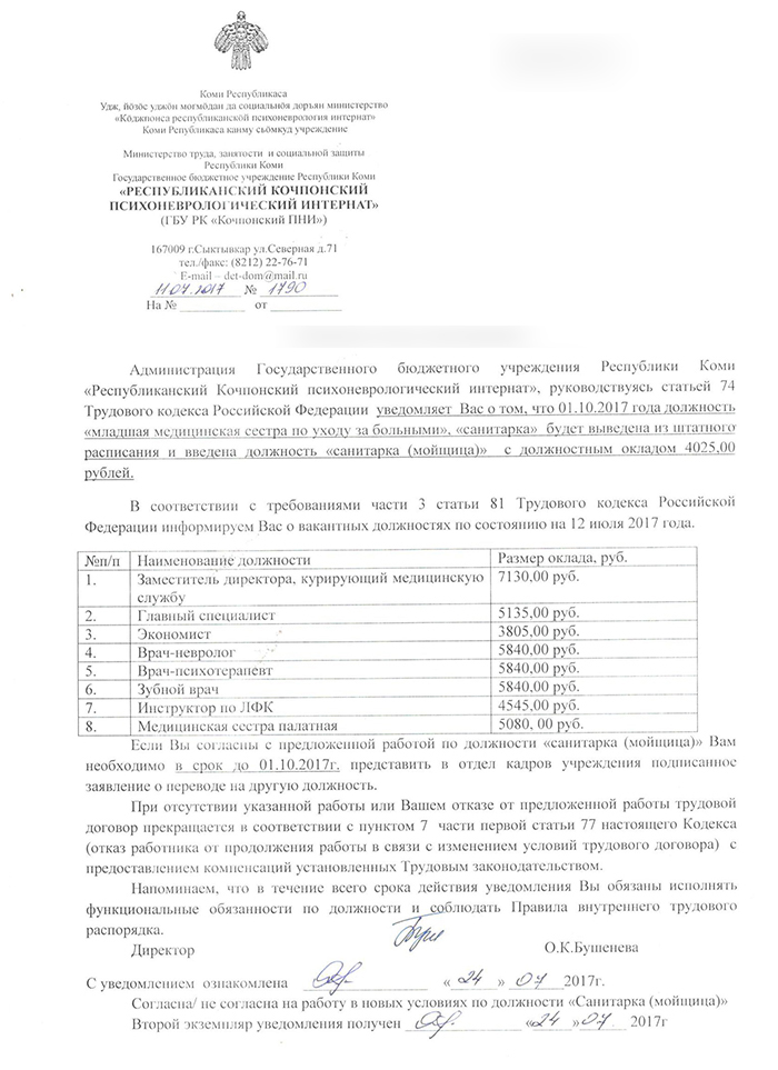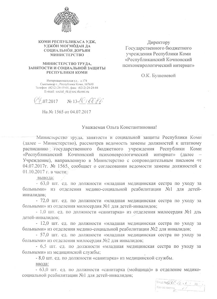 Министерство труда, занятости и социальной защиты Коми работникам РКПИ согласовало замену должностей 7 июля 2017 года.