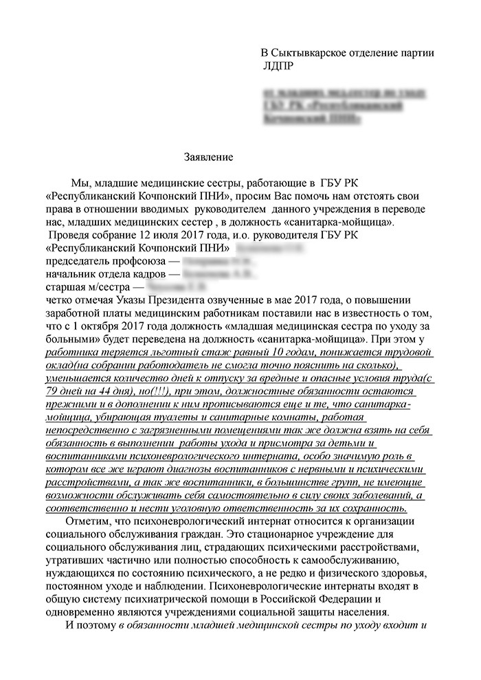 Сотрудники Коми республиканского психоневрологического интерната написали коллективное обращение против снижения заплаты