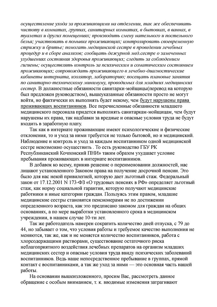 Сотрудники, представляющие младший медицинский персонал интерната, 12 июля провели собрание, по итогам которого составили заявление с требованием отменить распоряжение о переводе персонала на другие должности. В документе говорится, что в обязанности санитарок не входит уход за воспитанниками интерната, большинство из которых имеет психологические и физические отклонения. Если работники в новой должности не будут выполнять прежние обязанности, ухудшатся условия пребывания воспитанников, если согласятся и на новые, и на прежние обязанности — это будет нарушением прав самих работников. Коллективные обращения отправлены в инспекцию по труду, министерство труда и социальной защиты, министерство здравоохранения, Общественную палату и прокуратуру республики, а также в Общественную приемную главы Коми.