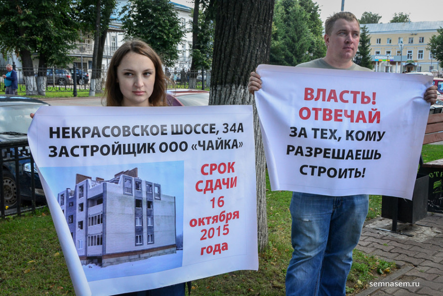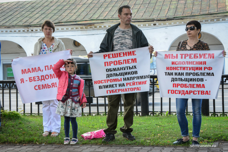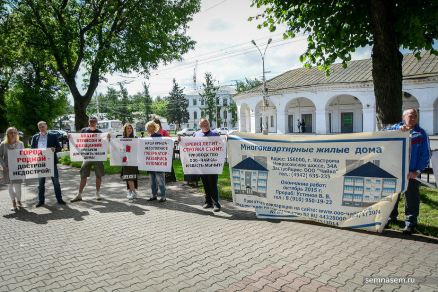 Достроить два дома по Некрасовскому шоссе, ввод которых был намечен на октябрь 2015 года, — с таким требованием обманутые дольщики 25 июля вышли на пикет в Ботниковском сквере перед мэрией Костромы, передает корреспондент «7х7».