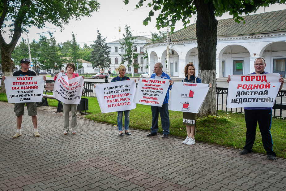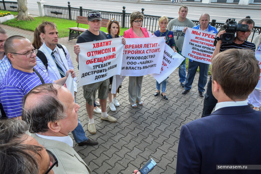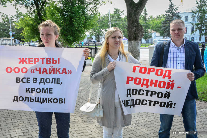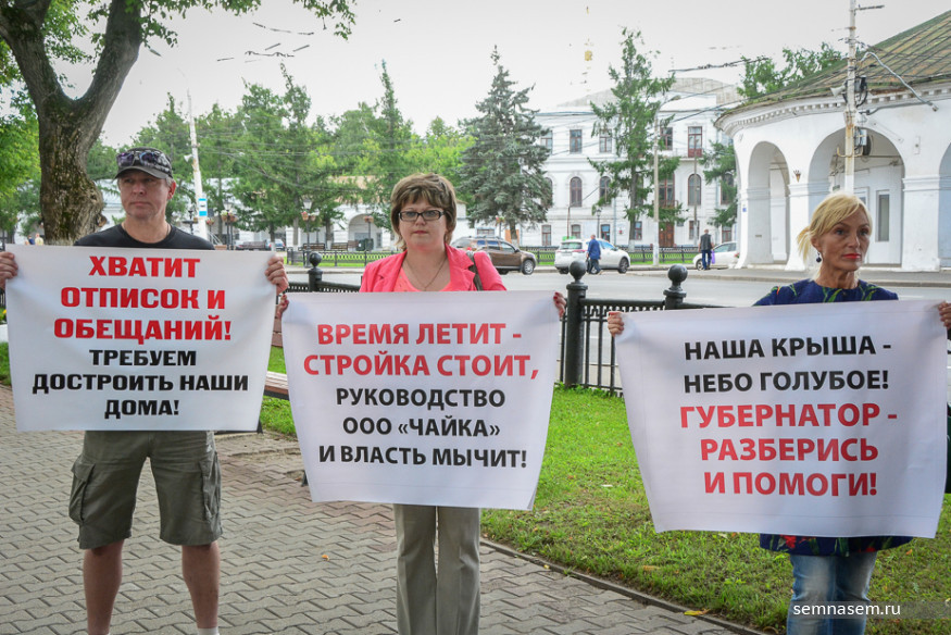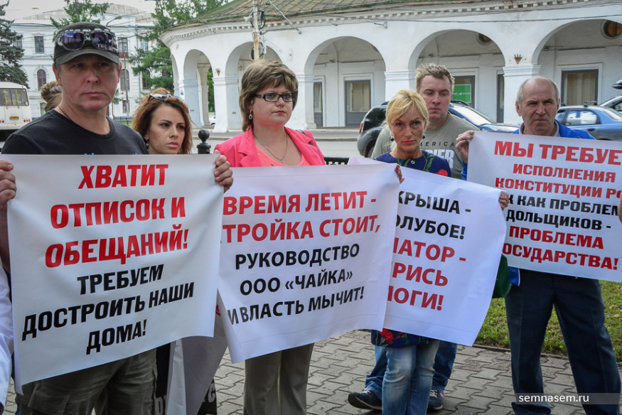 «Хватит отписок и обещаний. Требуем достроить наши дома!», «Время летит — стройка стоит, руководство ООО „Чайка“ и власть мычит!», «Наша крыша — небо голубое. Губернатор, разберись и помоги!», «Город родной, дострой недострой!» — гласили плакаты в руках пикетчиков.