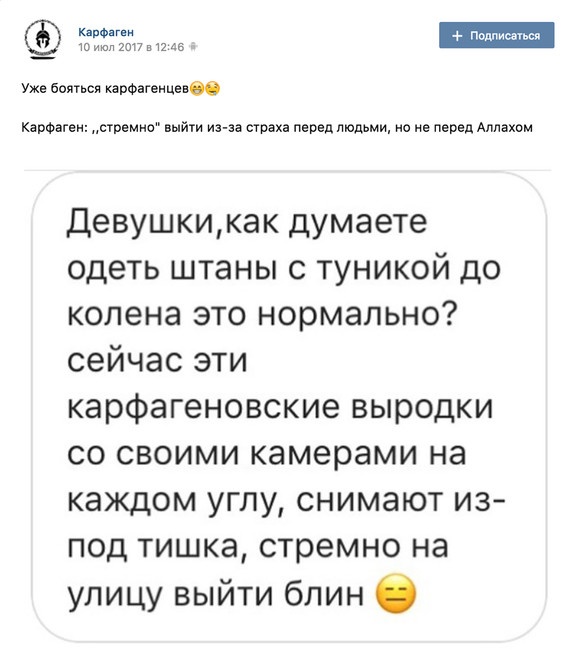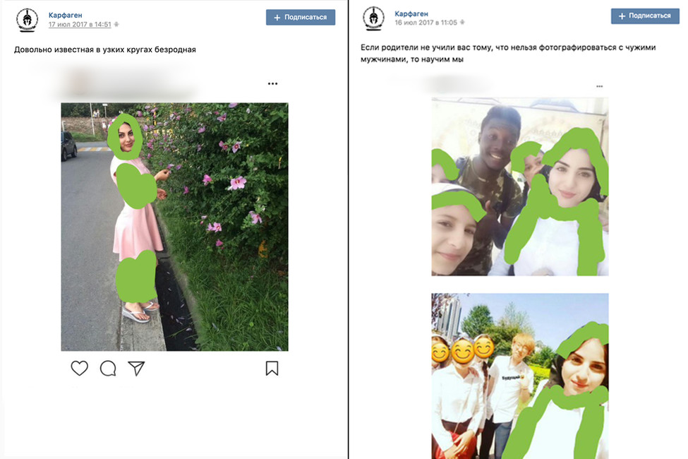 На странице «Карфагена» публикуются фотографии чеченок из их аккаунтов в Инстаграме, иногда и со ссылками на родственников жертвы. Участники группы призывают родных девушки «разобраться» и проследить за поведением девушки в соцсетях.