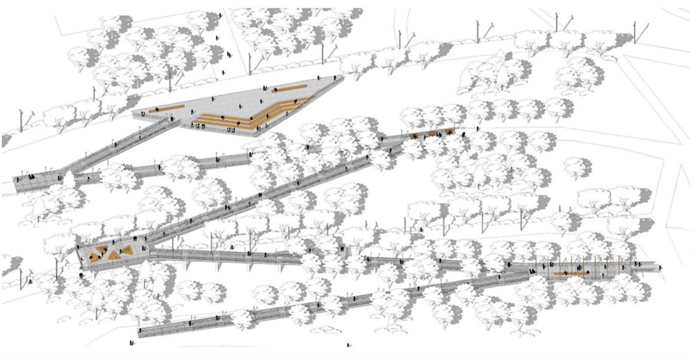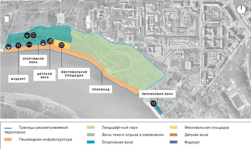 Специалисты конструкторского бюро «Стрелка» и компании «Новая земля» предлагают благоустроить территорию нижней террасы Лагерного сада. Они отмечают, что сейчас до этого места трудно добраться, а зимой здесь практически ничего не происходит, и предлагают поделить все пространство на ряд зон.