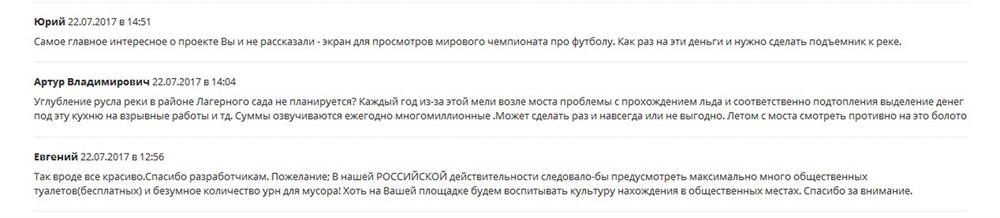 На публичных слушаниях представленный проект оценили противоречиво. Так блогер Катерина Маас обратила внимание на то, что в проекте не предусматриваются стационарные пункты полиции и зона для выгула собак.