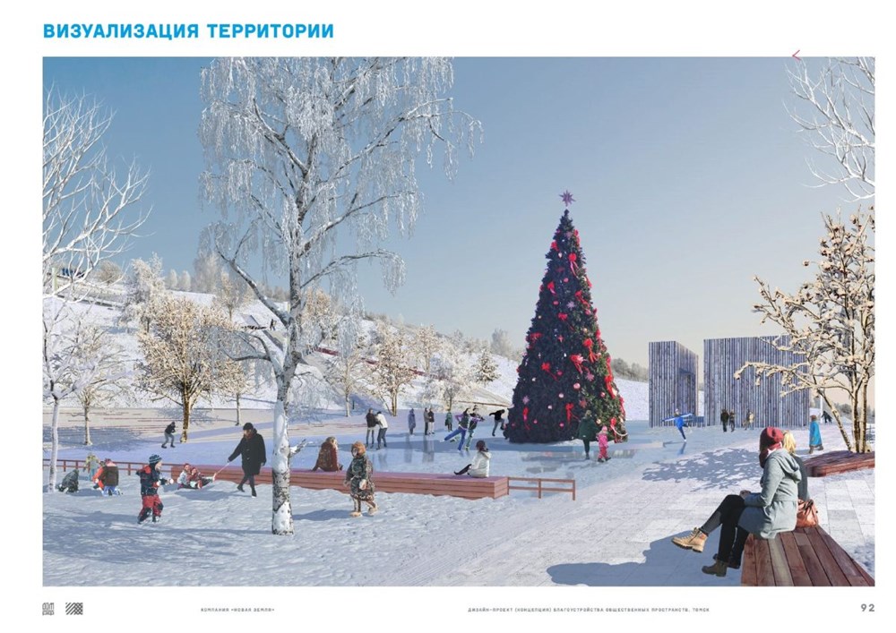 Вдоль Томи, согласно проекту, обустроят зону променада с малыми архитектурными формами из лиственницы, которые одновременно будут выполнять функции скамеек и элементов озеленения. Здесь же будет создан и пандус, соединяющий "активную" и "спокойную" зоны и связывающий таким образом пространство от смотровой площадки у монумента до фестивальной зоны.