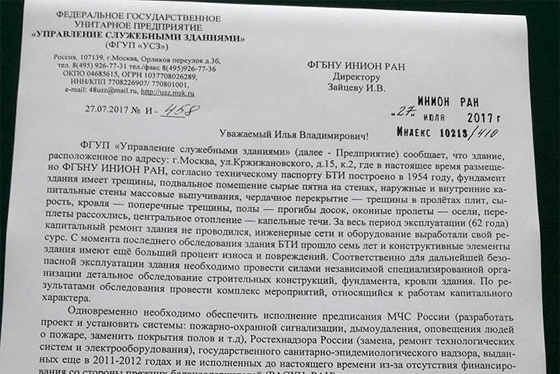 Как сообщает в фейсбуке ведущий научный сотрудник ИНИОН, профессор РГГУ Оксана Киянская, предписание пришло из ФГУП «Управление служебными зданиями» при Министерстве сельского хозяйства РФ.