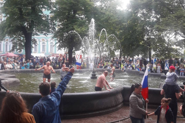 В День военно-морского флота в фонтане у Эрмитажа искупались несколько человек в тельняшках. Об этом сообщают очевидцы в социальных сетях.