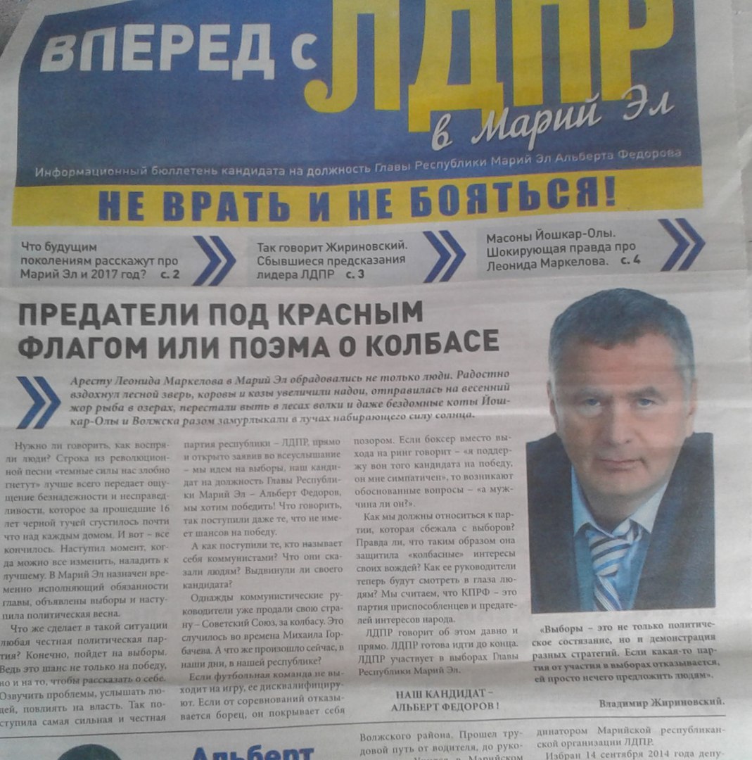 Вчера, в почтовом ящике обнаружил газету «Вперёд с ЛДПР в Марий Эл». Не будучи поклонником господина Жириновского, всё же обратил внимание на статью «Предатели под красным знаменем или поэма о колбасе».В этой статье господин Жириновский клеймит позором решение Марийских Коммунистов, выраженное на Конференции 22.06.17., в работе которой принял участие выдвиженец от «Единой России» кандидат на пост Главы Марий, Евстифеев А.А. Не стесняясь в выражениях, господин Жириновский вопрошает: « Как мы должны относиться к партии, которая сбежала с выборов? Правда ли то, что таким образом она защищала «колбасные» интересы своих вождей? Как её руководители теперь будут смотреть в глаза людям?» Далее господин Жириновский с издёвкой продолжает: « Мы считаем, что КПРФ – это партия приспособленцев и предателей интересов народа».