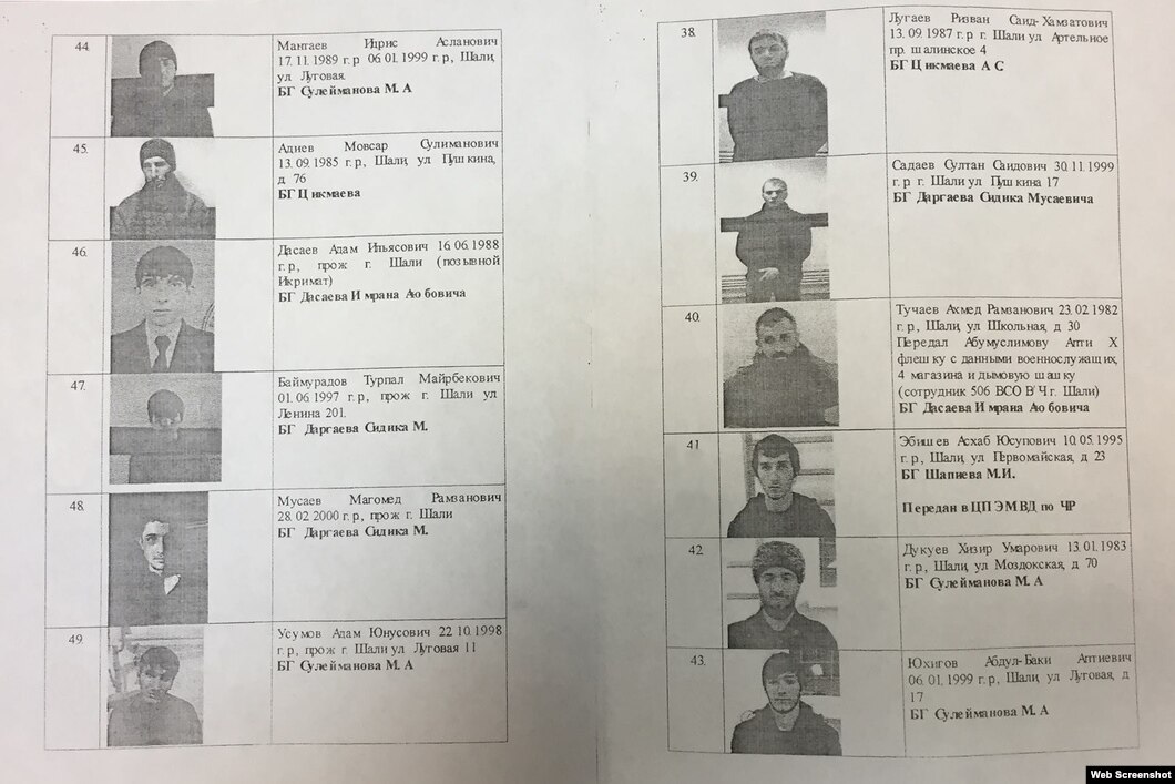 "Новая газета" получила ксерокопии фототаблиц, составленных сотрудниками МВД по Чечне, где перечислены задержанные молодые люди судьба которых неизвестна по сегодняшний день.