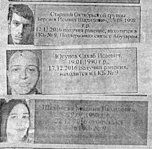 В фототаблице, которая оказалась в распоряжении «Новой газеты», фигурируют все трое задержанных: Исмаил Бергаев, Сахаб Юсупов и 18-летняя Мадина Шахбиева. В результате ранений все они были госпитализированы в ГКБ № 9 г. Грозного. После помещения в больницу, по сведениям «Кавказского узла», задержанным была оказана медицинская помощь (Мадине Шахбиевой ампутировали раздробленную пулей ногу), общее состояние всех троих позволяло «принимать участие в следственных действиях».