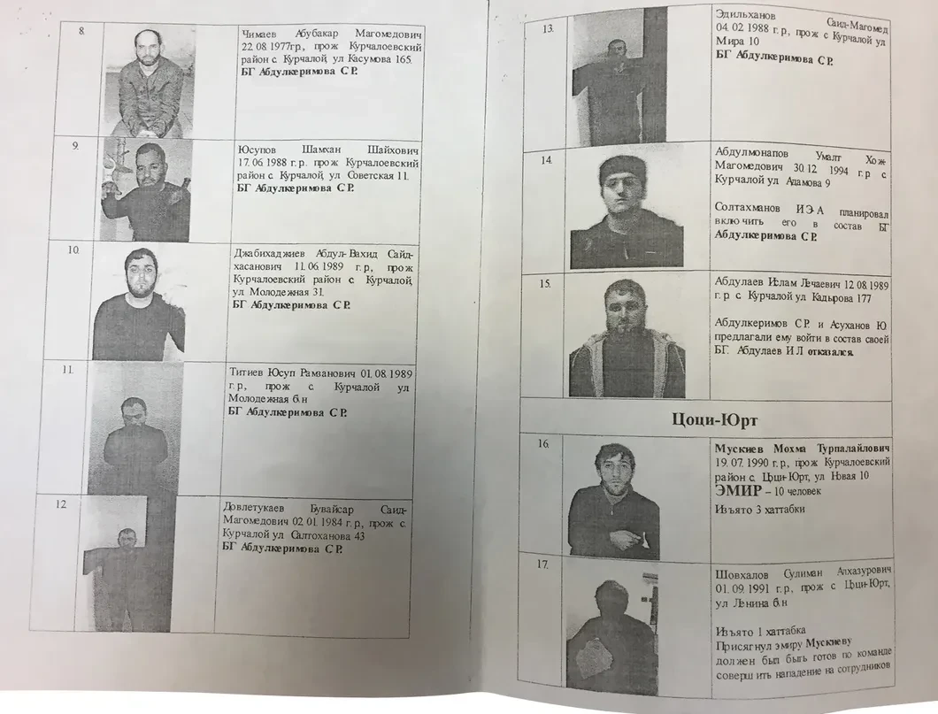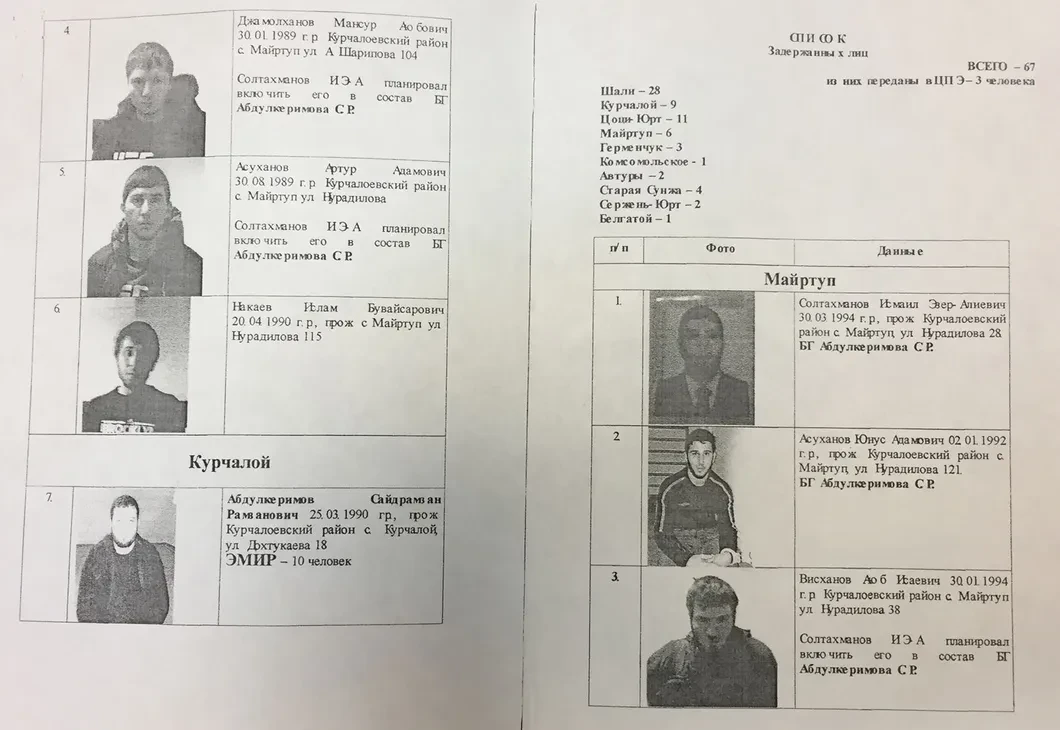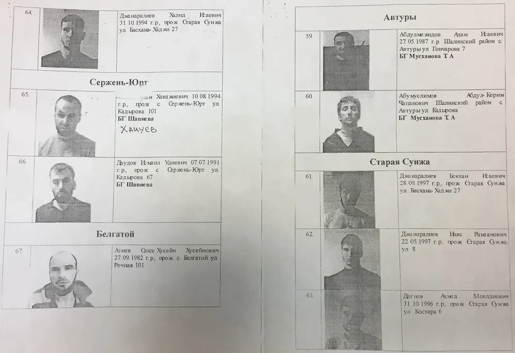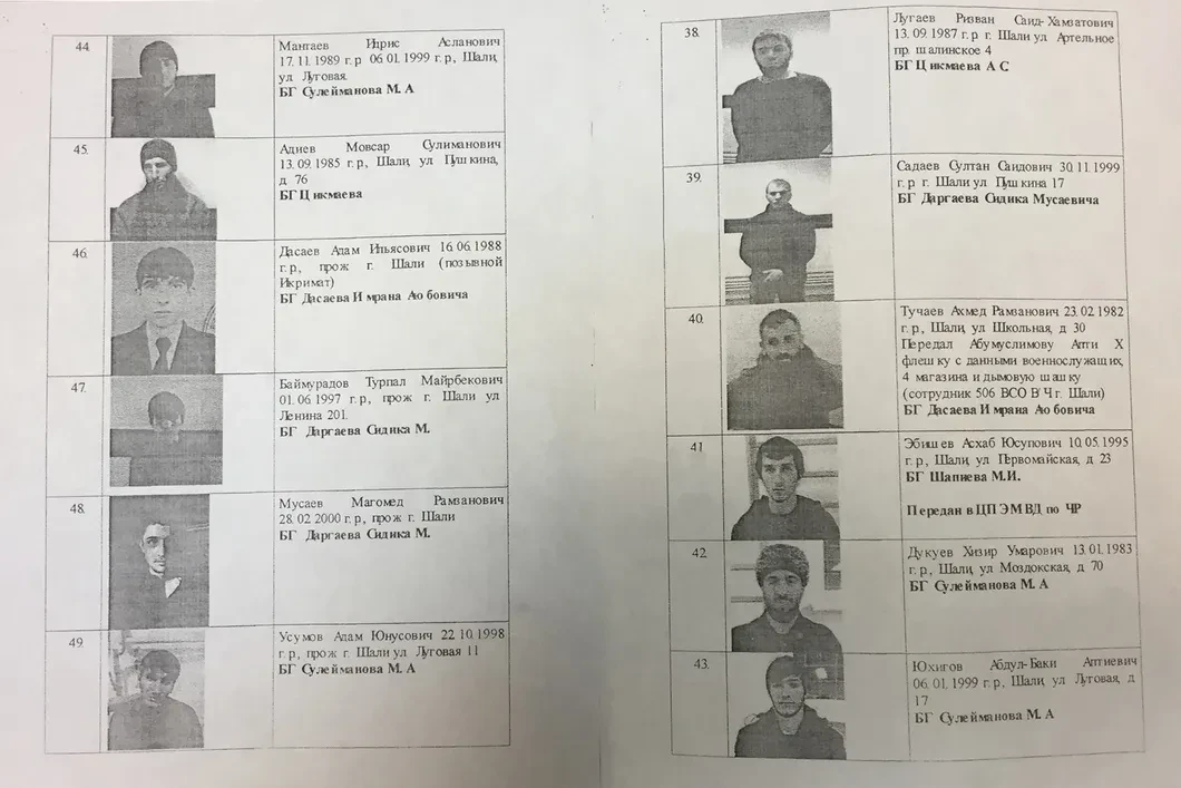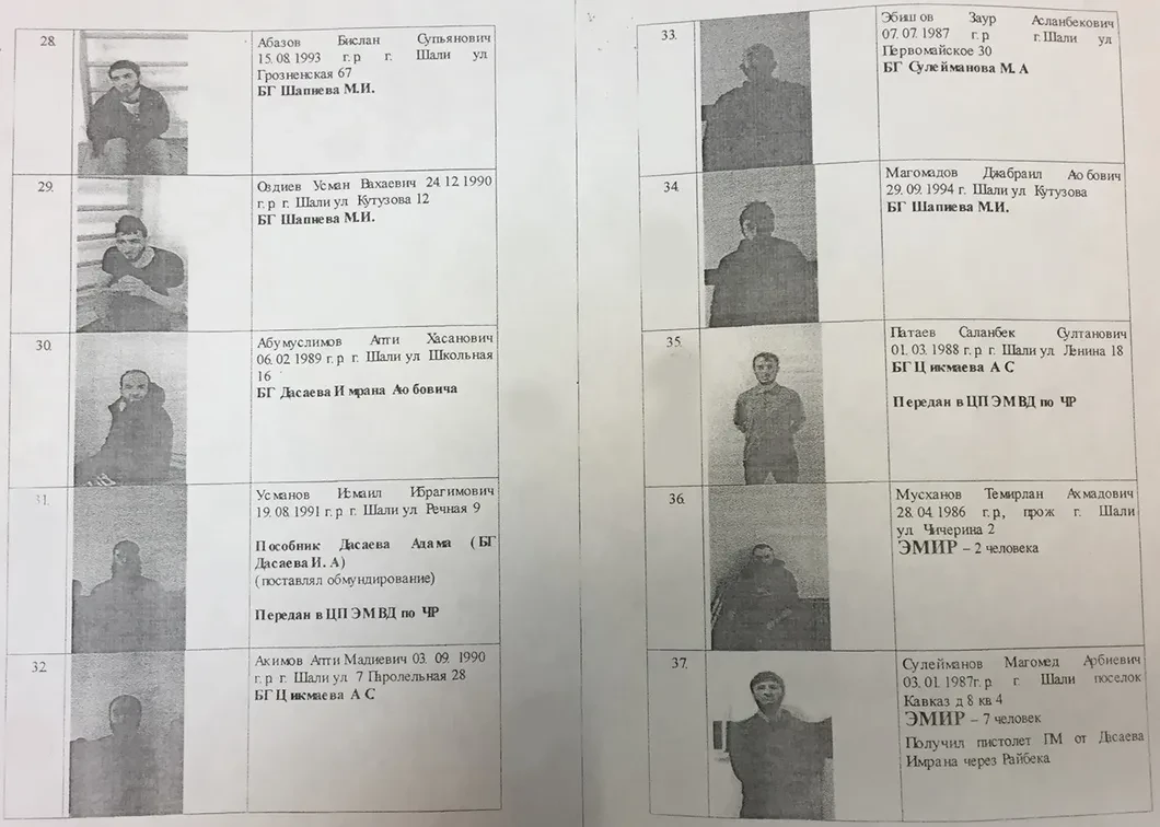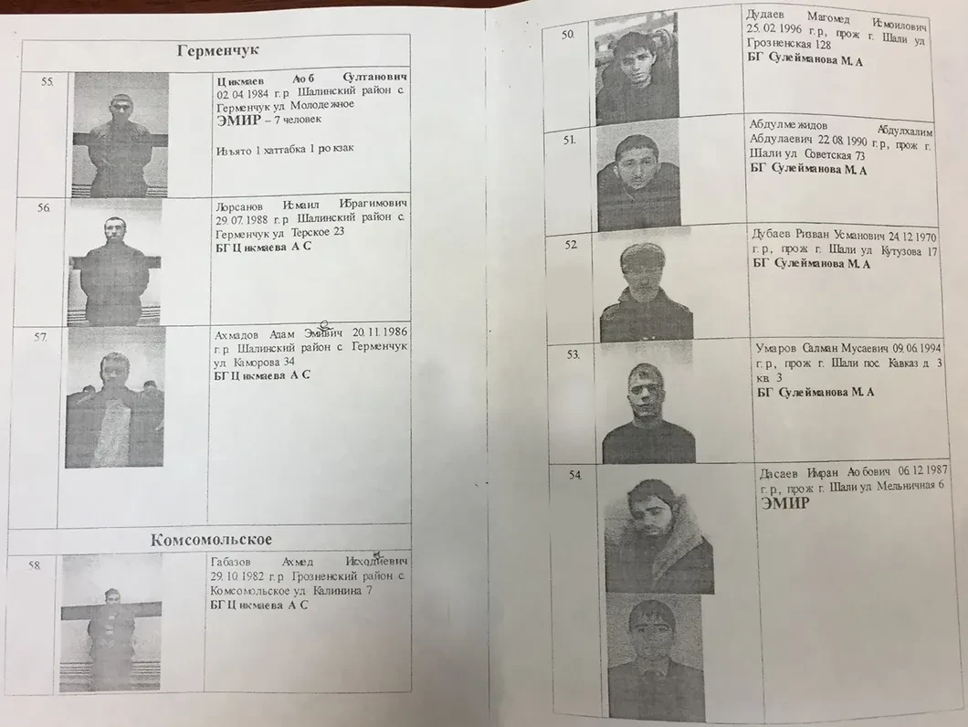 Позднее «Новая газета» получила ксерокопии фототаблиц, составленных сотрудниками МВД по Чечне. Они плохого качества, однако их данные подтверждаются заявлениями родственников по фактам задержания их близких чеченскими силовиками.