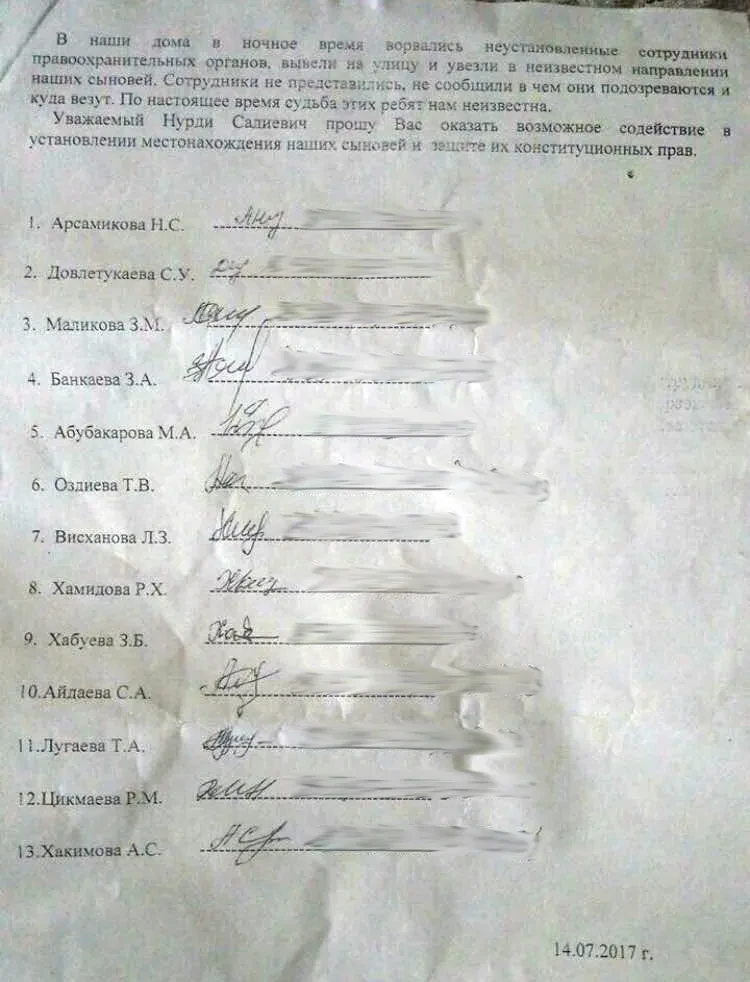 Уважаемый Нурди Садиевич прошу Вас оказать возможное содействие в установлении местонахождения наших сыновей и защите их конституционных прав».