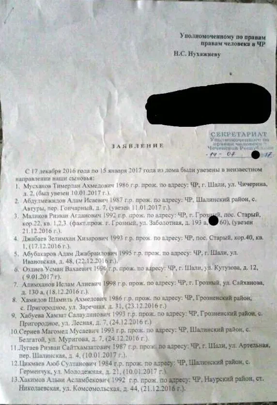 Информация из этой полицейской таблицы подтверждается еще одним документом. Мы получили его из секретариата Уполномоченного по правам человека при главе Чечни Нурди Нухажиева. Это — одно из многочисленных заявлений, с которыми родственники задержанных на протяжении восьми месяцев обращаются во всевозможные республиканские инстанции.