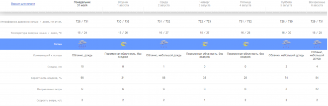 В субботу, 5 августа, ночью ожидается 16°С. Днем столбик термометра покажет 30°С. Осадки.