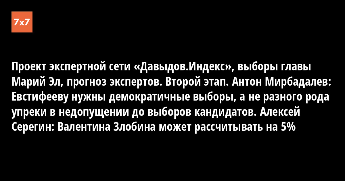 Проект экспертной сети «Давыдов.Индекс», выборы главы Марий Эл, прогноз экспертов. Второй этап. Антон Мирбадалев: Евстифееву нужны демократичные выборы, а не разного рода упреки в недопущении до выборов кандидатов. Алексей Серегин: Валентина Злобина может рассчитывать на 5%