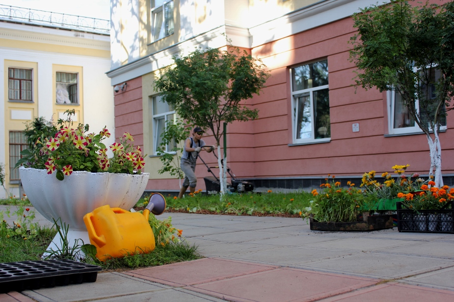 Около библиотеки много рабочих, которые стригут газоны, высаживают цветы, чинят бордюры и шпаклюют крыльцо.