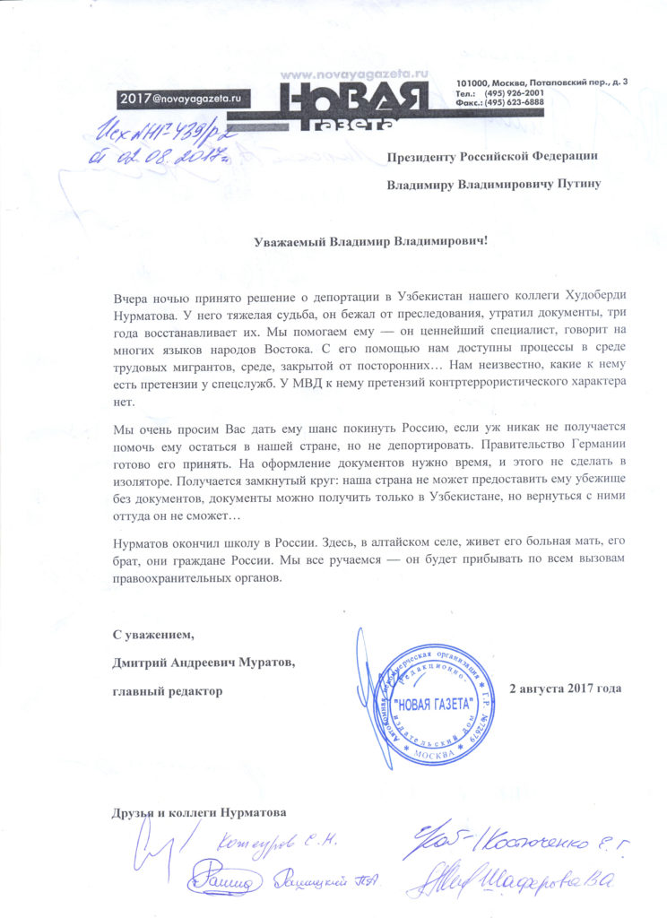 Скриншот письма с сайта Совета при президенте Российской Федерации по развитию гражданского общества и правам человека / www.president-sovet.ru «Мы очень просим Вас дать ему шанс покинуть Россию, если уж никак не получается помочь ему остаться в нашей стране, но не депортировать. Правительство Германии готово его принять», — пишет главный редактор газеты Дмитрий Муратов. Он также отмечает, что Али Феруз является ценнейшим специалистом, поскольку говорит на многих восточных языках и помогает редакции освещать судебные процессы в среде трудовых мигрантов.