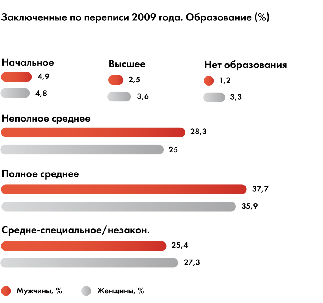 Треть заключенных не имеет среднего образования, больше трети имеют только среднее образование.
