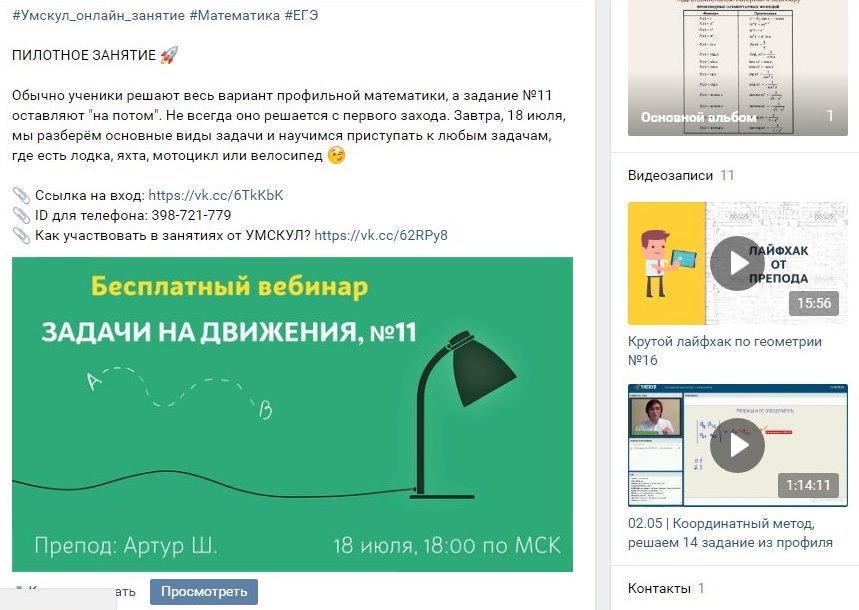 Группа «ВКонтакте» «УМСКУЛ. Онлайн-школа по подготовке к ЕГЭ» со ссылками на все профильные группы