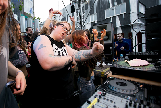 © Present Perfect Festival 2017 Тем, кто пришел на 20-часовой марафон в субботу (5 сцен, более 40 диджеев и музыкантов), с погодой повезло меньше: дождь то игриво накрапывал по разноцветным дождевикам, то заряжал в полную силу, загоняя пришедших на площадки под крышей. Они, понятное дело, пользовались из-за погоды особенным успехом. На сцене вечеринки Boiler Room было не протолкнуться практически всю ночь, при том что музыку здесь играли предельно некоммерческую и жесткую: вроде мрачного электро нидерландца Das Ding или гетто-тека DJ Godfather. Бит и бас здесь ощущались всем телом (спасибо отражающим звук кирпичным стенам), а темноту от пола до потолка прорезали красные лазеры. Пространство другой сцены Garden было огорожено металлическими клумбами с осокой и папоротником — музыка здесь была доступнее и человечнее. Петербургский диджей и музыкант Kito Jempere ставил винтажный душевный хаус, а под конец своего сета порадовал бывалых клаберов суперхитом «Insomnia» британской группы Faithless. Крен в сторону ретро был и у сменивших его диджеев Rozet и El, которые невольно оказались в тени директора отдела моды и искусства журнала «Собака» Ксении Гощицкой, танцевавшей в диджейке и с большим красным цветком в зубах.