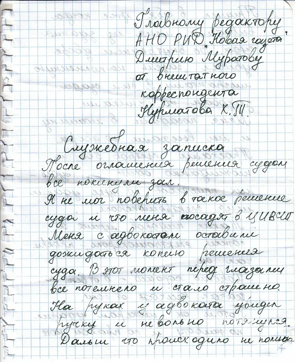 СЛУЖЕБНАЯ ЗАПИСКА ХУДОБЕРДИ НУРМАТОВА (АЛИ ФЕРУЗА) — ГЛАВНОМУ РЕДАКТОРУ «НОВОЙ ГАЗЕТЫ»