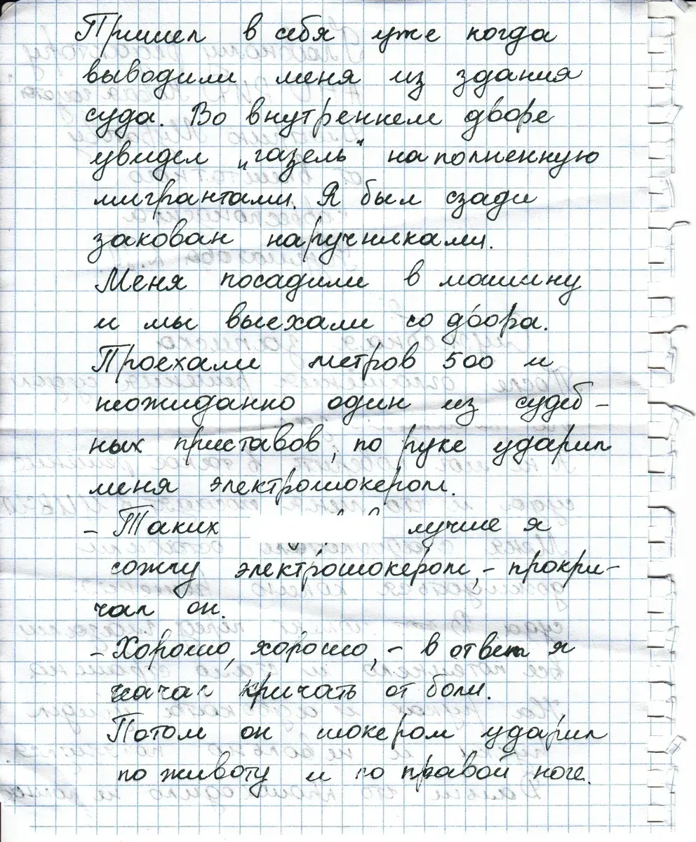 Я был сзади закован наручниками. Меня посадили в машину, и мы выехали со двора. Проехали метров 500 и неожиданно один из судебных приставов по руке ударил меня электрошокером.