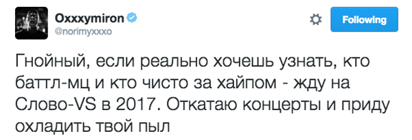 Оксимирон вызвал Гнойного на баттл в 2016 году, после того как последний в поединке с Эрнесто Заткнитесь зачитал отрывок, в котором рассказал о своих претензиях к Оксимирону.