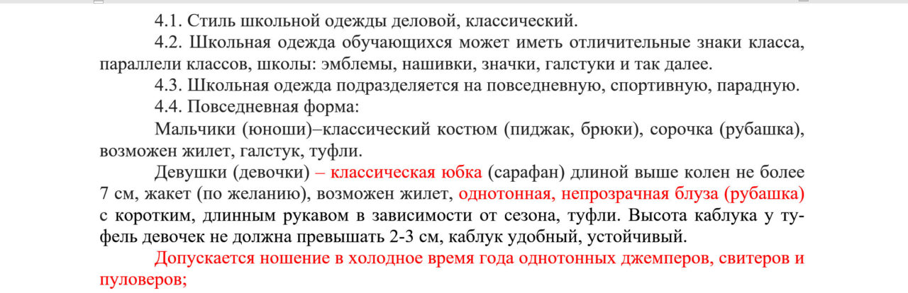 Отрывок из «Положения о единых требованиях к внешнему виду и одежде обучающихся МАОУ СОШ №92 города Тюмени» Департамент образования Тюмени, комментируя ситуацию, объяснил, что требования к одежде формирует школа. Они должны составляться с учетом мнения родительского совета и совета школьников. Родители первоклассницы направили жалобу на школьные правила в прокуратуру.