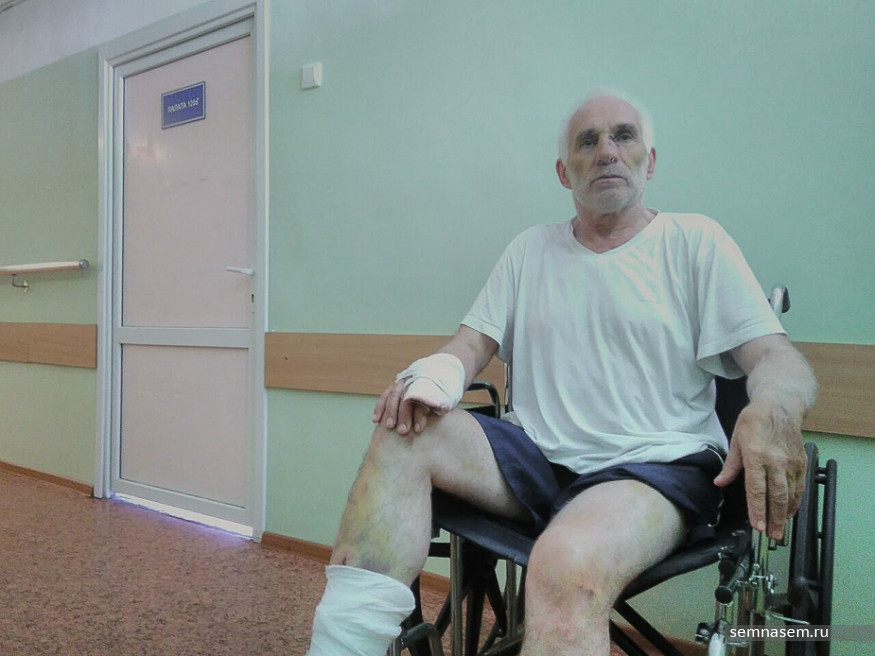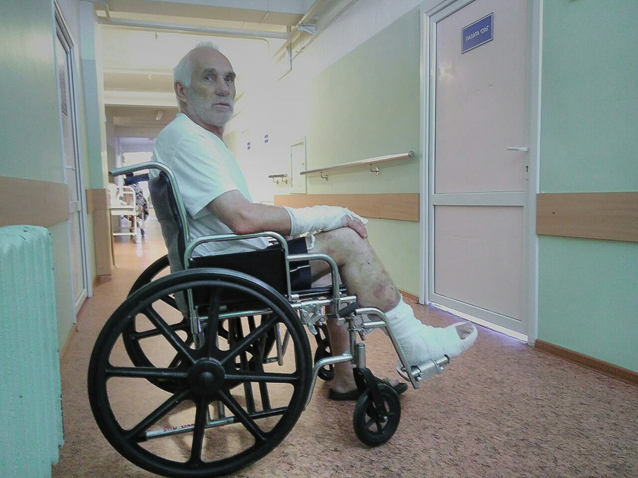 Дверь палаты в середине коридора открывается, и из нее задним ходом выезжает коляска. Пенсионер отталкивается от пола не загипсованной левой ногой, ею же и маневрирует. Говорит, так передвигаться проще и быстрее. От помощи отказывается — он уже наловчился. Но говорить Станиславу Егорову до сих пор трудно из-за травмы.