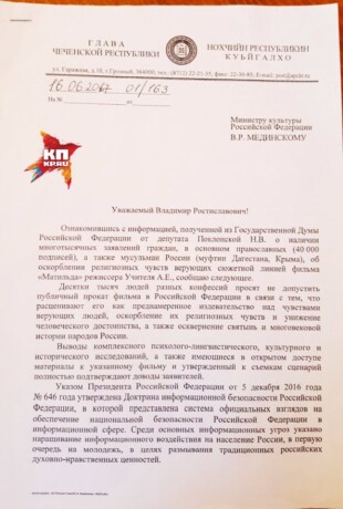 В документе, подписанном 16 июня, президент Чеченской республики обратил внимание на то, что «десятки тысяч людей разных конфессий просят не допустить публичный прокат фильма». По его словам, они недовольны подобным «издевательством над чувствами верующих людей, а также «осквернением святынь и многовековой истории народов России».