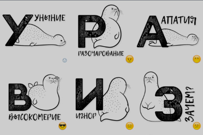 В стикерпак вошли стикеры, на которых тюлень Петя показывает, как выглядят «уныние», «апатия» и «тлен». Тюлень из Петербурга также предлагает портвейн и вопрошает «зачем?». Стикерпак можно добавить по ссылке.