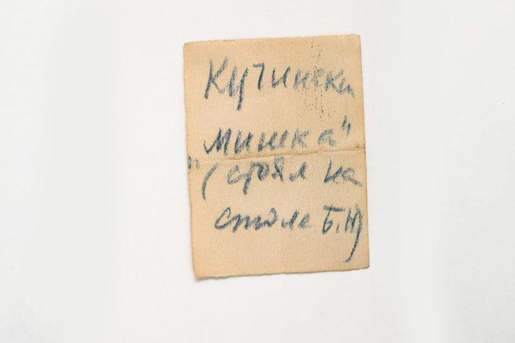 Этот саквояж — послание из прошлого. Клавдия Николаевна знала, что люди, которые откроют его, ничего не поймут, поэтому она сложила туда самые любимые вещи Белого и снабдила каждую вещичку запиской. Когда читаешь эти записки, возникает другое представление о Белом как о человеке. Вот, например, свисток Андрея Белого. С 1925 года Бугаевы жили в деревне Кучино. Это кучинский свисток, на бумажке подписано: «Борису Николаевичу для безопасности». Видимо, он ходил по деревне и носил его с собой на случай если нападут. Есть сувенирчик — мягкая самодельная игрушка, медвежонок, которая стояла у великого писателя на столе. Больше всего я люблю эту тряпочку, потому что если бы не было записки Клавдии Николаевны, то мы посчитали бы ее случайно попавшей, а на самом деле это — «один из кусков материи, с которой Борис Николаевич списывал цвета для романа „Москва“».