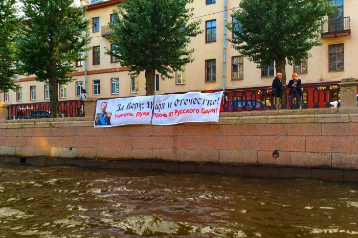 Неизвестные повесили баннер с портретом Николая II напротив студии режиссера фильма «Матильда» Алексея Учителя на Крюковом канале.
