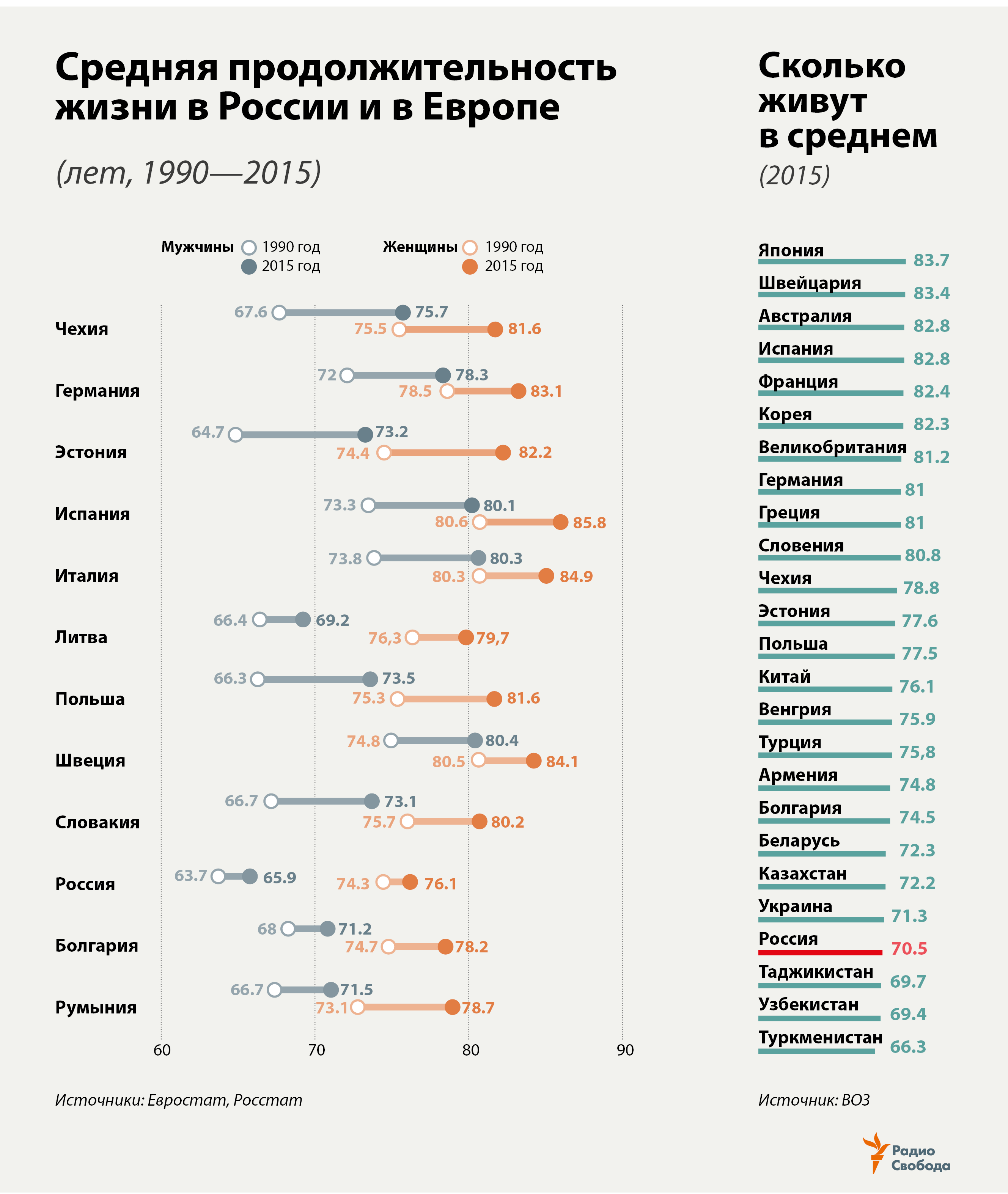 По текущим оценкам ВОЗ, самая высокая среди стран бывшего СССР продолжительность жизни мужчин сегодня – в Эстонии (72,7 года) и Армении (71,6), самая низкая – в Туркмении (62,2) и России (64,7). Для женщин самые высокие уровни отмечены в Эстонии (82) и Латвии (79,2), а самые низкие – в Туркмении (70,5) и Узбекистане (72,7).