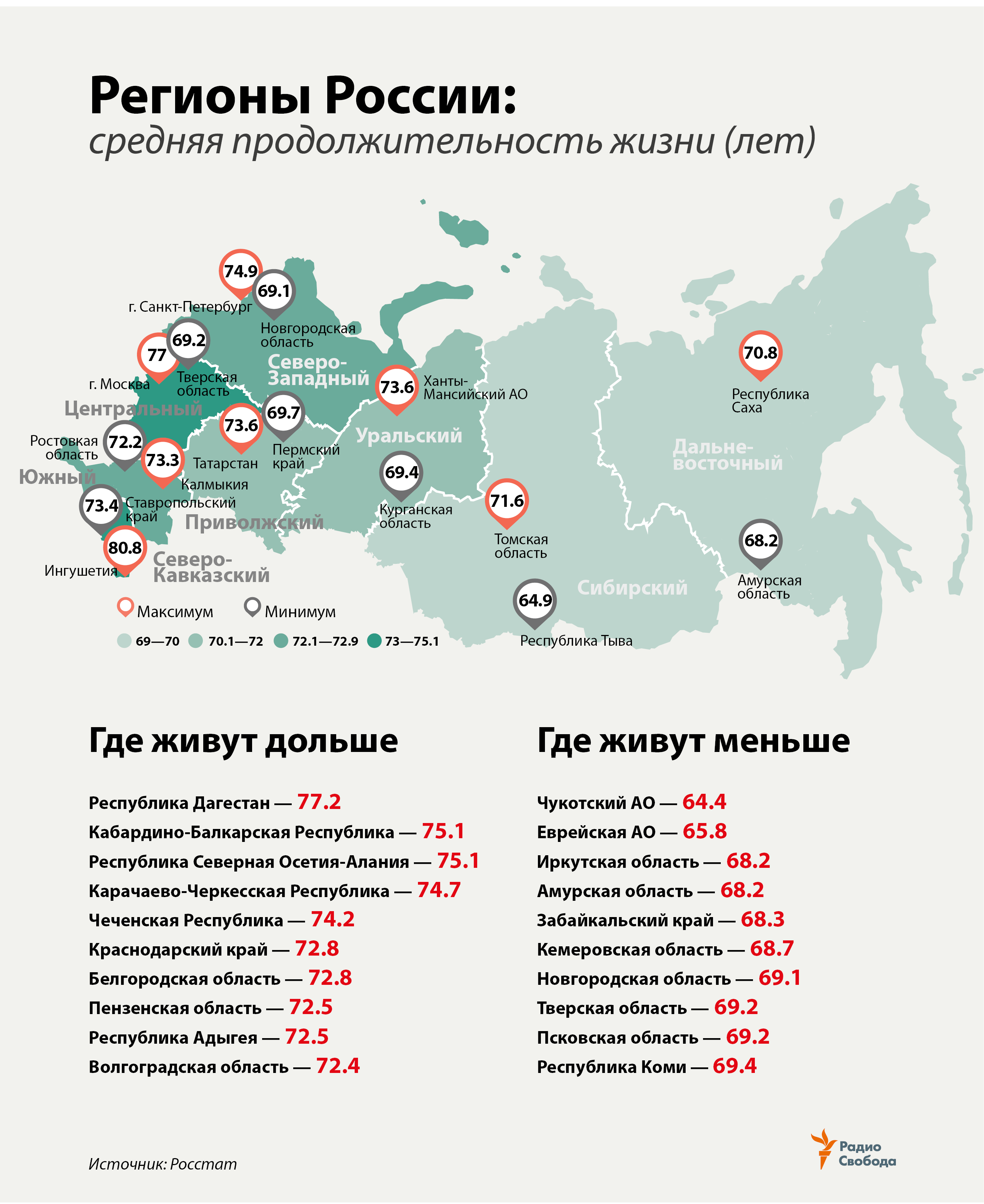 На другом полюсе – более половины регионов России, где продолжительность жизни ниже средней по стране. По данным Росстата, в 45 из них средний показатель в 2016 году не превысил 70 лет, а разница в средней продолжительности жизни между отдельными регионами могла превышать 16 лет. Самые низкие показатели зафиксированы в Республике Тыва (64,2 года), Чукотском автономном округе (64,4) и Еврейской автономной области (65,8). В целом по регионам Сибири и Дальнего Востока они не превышают 69 лет.