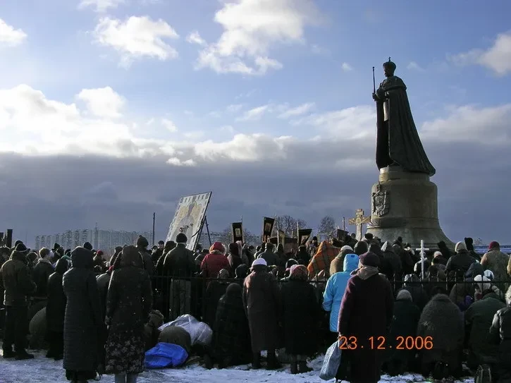 «Чин всенародного покаяния» — культовое для «царебожников» священнодействие — у памятника Николаю II в подмосковном селе Тайнинское.