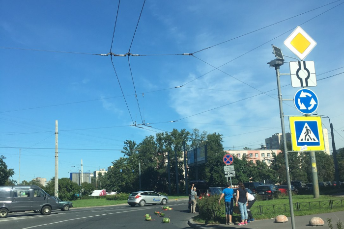 На круговом пересечении проспекта Ветеранов и Дачного проспекта рассыпались арбузы. Об этом в 15:26 сообщила очевидица в паблике «ДТП и ЧП».
