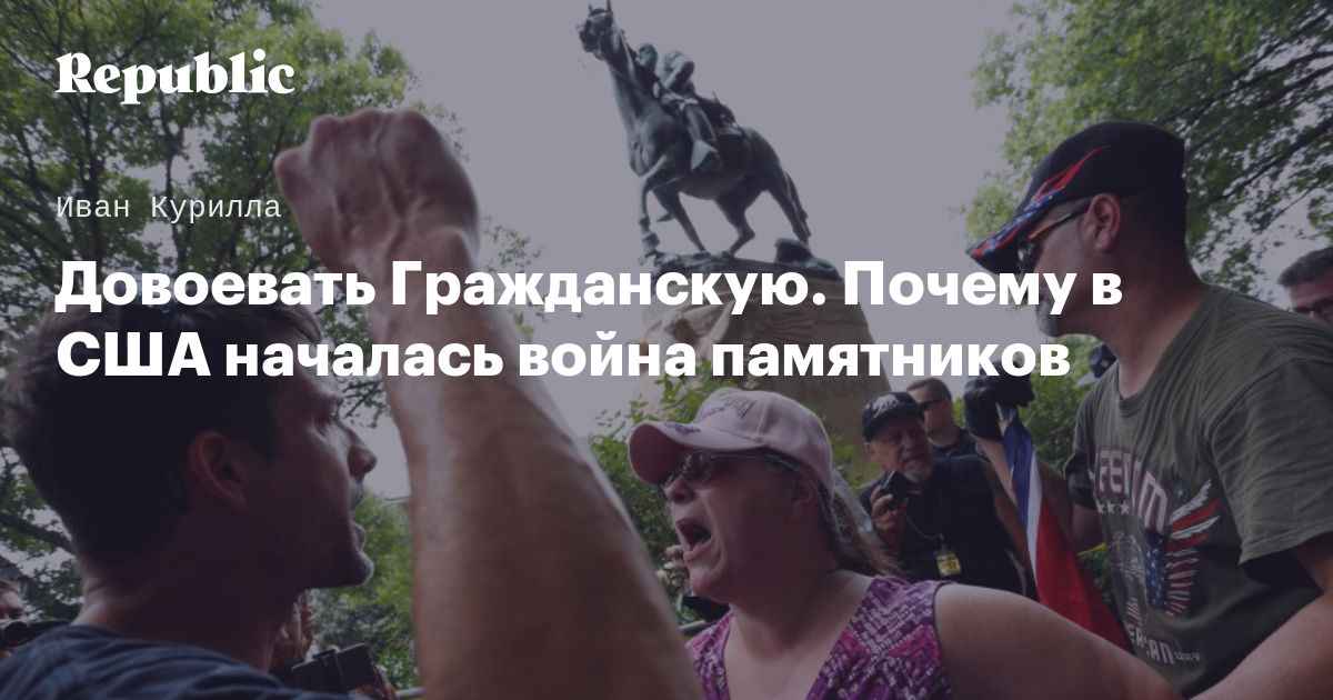 В США сносят памятники, связанные с Конфедеративными Штатами Америки – проигравшей стороне в Гражданской войне, завершившейся в 1865 году, больше полутора веков назад. В битве вокруг символов появились первые жертвы. В минувшую субботу предположительно крайне правый активист въехал на автомобиле в толпу сторонников сноса памятника главнокомандующему армией Северной Виргинии генералу Роберту Эдварду Ли в виргинском городе Шарлотсвилл, убив одну участницу и ранив еще девятнадцать.