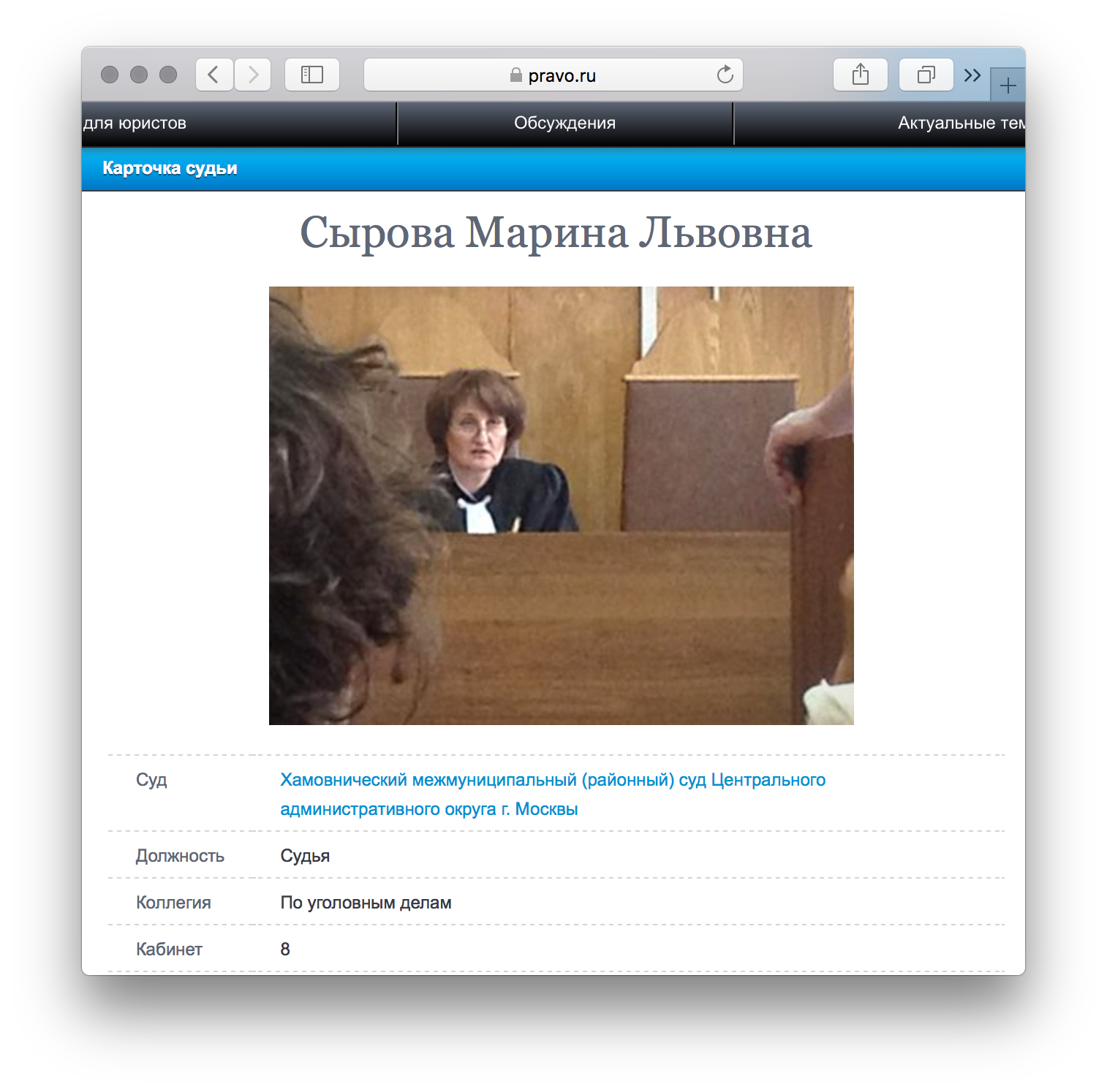 Сразу две базы данных — официальный сайт, где публикуются вынесенные в России судебные решения, и неофициальная база «Росправосудие» — перестали публиковать решения судьи Сыровой с марта 2016 года. Из этих баз следует, что рассматривала она преимущественно административные и мелкие уголовные дела. Например, штрафовала на 20 тысяч рублей граждан, организовавших незаконное пребывание иностранцев в России. Тем не менее Сырова продолжает работать: в мае 2017-го она приговорила к девяти годам лишения свободы бывшего президента «Внешпромбанка» Ларису Маркус за хищение денег.