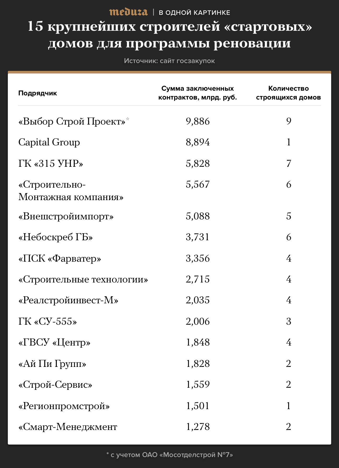 Как уже сообщала «Медуза», московские власти готовились к новой программе по сносу жилых домов и переселению их жителей последние несколько лет. В частности, новостройки для будущих переселенцев начали возводить еще до того, как прошло голосование по программе реновации, — на их проектирование и строительство городской бюджет уже потратил более 70 миллиардов рублей. Спецкор «Медузы» Иван Голунов внимательно изучил тех, кто получил эти деньги, и обнаружил среди них многочисленных знакомых и бывших партнеров вице-мэра Москвы Марата Хуснуллина, а также других интересных людей.