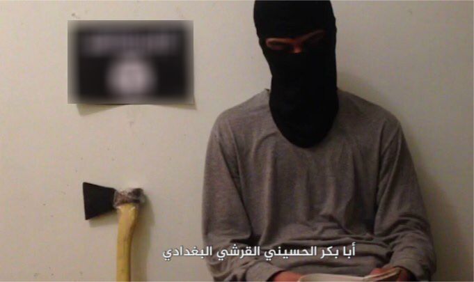 Рядом с Гаджиевым, который сидит в маске, к стене прислонен топор. На стене висит флаг «Исламского государства».