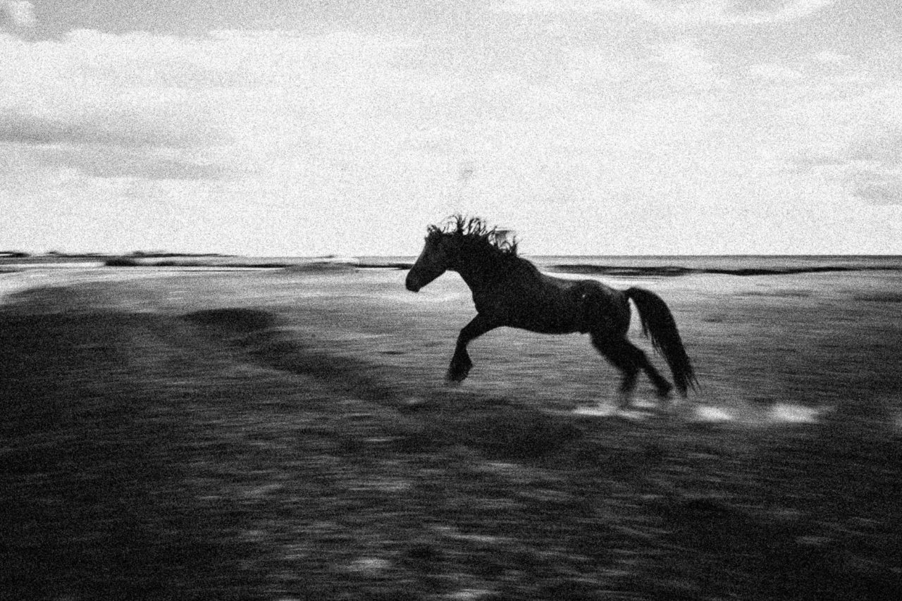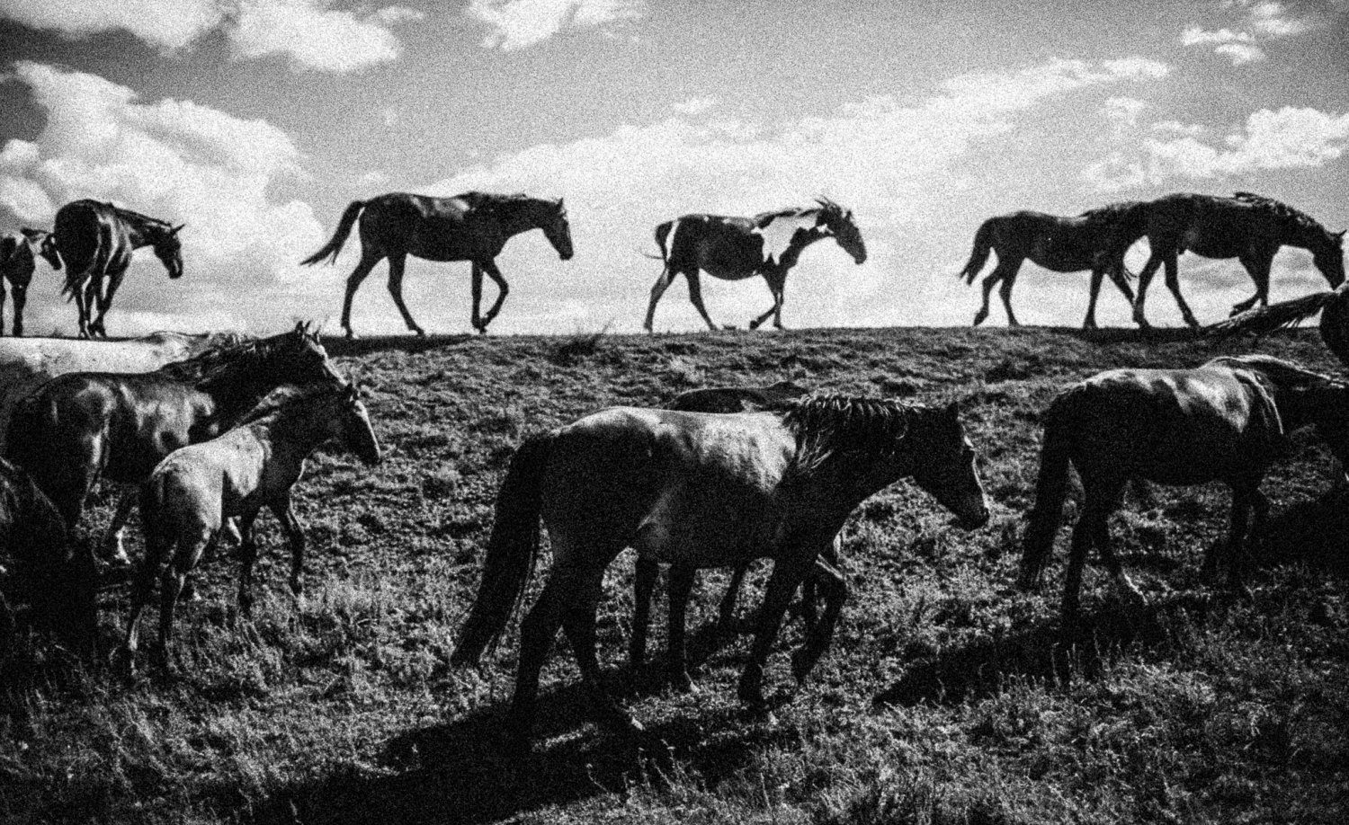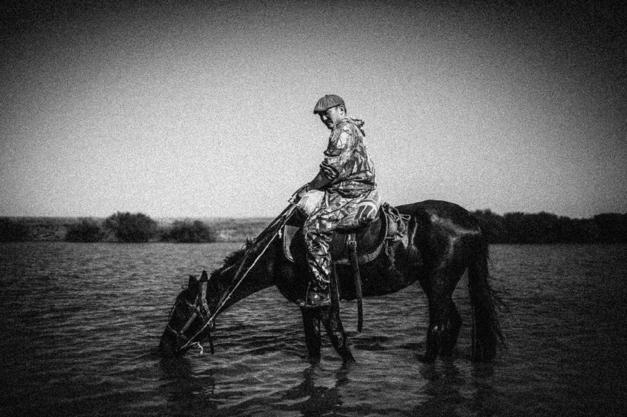 Вдалеке показался табун. Гнедые, бурые, вороные, цыганские (пятнистые) — всего около ста лошадей мчались к реке Торгун, подгоняемые табунщиком. Рядом с красивыми кобылами бегут жеребята. Это маточное поголовье, объясняет Дмитрий. Многие ожеребились всего пару месяцев назад. Во главе табуна — конь ахалтекинской породы. Очень жесткий жеребец, держит кобыл в строгости. За непослушание даже укусить может.