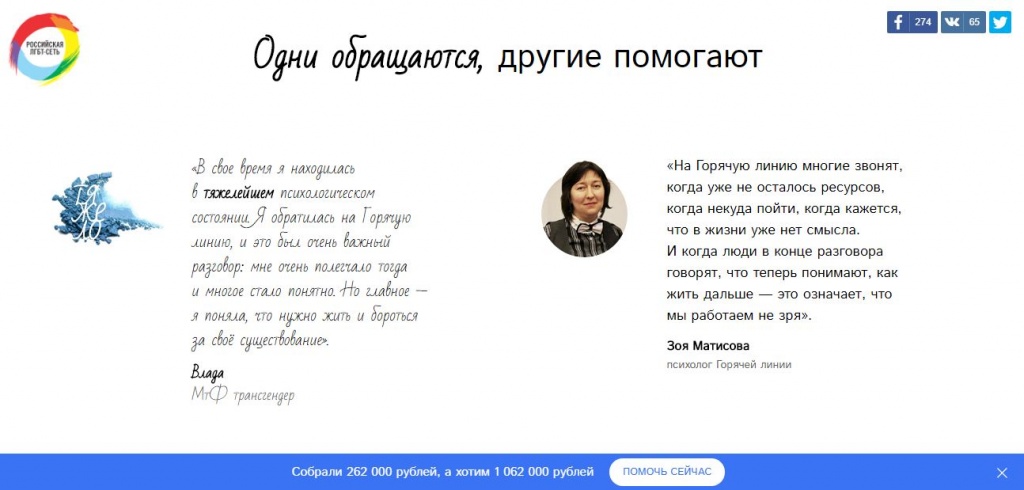 Эта трудность знакома межрегиональному общественному движению «Российская ЛГБТ-сеть», которое защищает права лесбиянок, геев, бисексуалов и трансгендеров, а также их родных и близких. Разобраться в этих проблемах, перезапустить онлайн-чат горячей линии и создать захватывающую внимание фандрайзинговую страницу движению помогла команда Бременских консультантов. Замредактора Теплицы Наталья Баранова узнала, как проект меняется на протяжении полутора лет и завоевывает все больше сторонников.