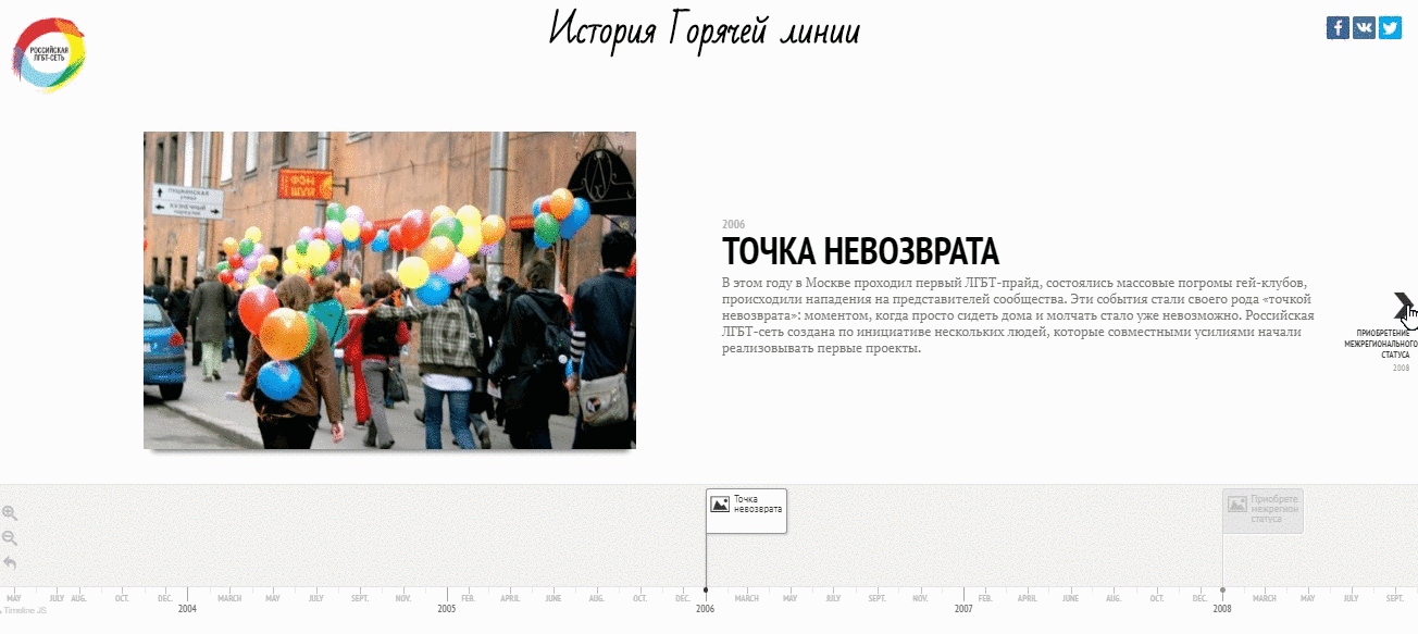 Например, в ответ на вопрос «Кто вы такие и почему вам стоит доверять?» решили показать историю ЛГБТ-сети в виде временной шкалы. «Мы погружаем людей в работу организации. Плюс в том, что и для ребят это ностальгия, увидеть, с чего все началось. Одним мы хотим сказать: «Смотрите, какое большое есть движение, все не зря, а других — познакомить. И сделать это в один экран», — объясняет Татьяна Толстенева.