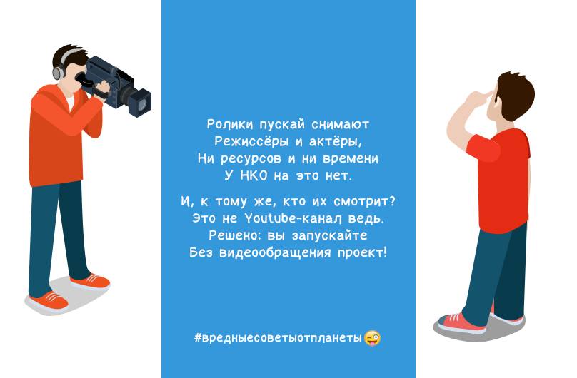 Видеообращение – один из обязательных элементов краудфандинговой кампании. Но, по словам Наталии Игнатенко, некоторые авторы благотворительных проектов игнорируют его. На эту тему специалисты Planeta.ru даже сочинили шутливые «вредные советы», которые отправляли представителям НКО.