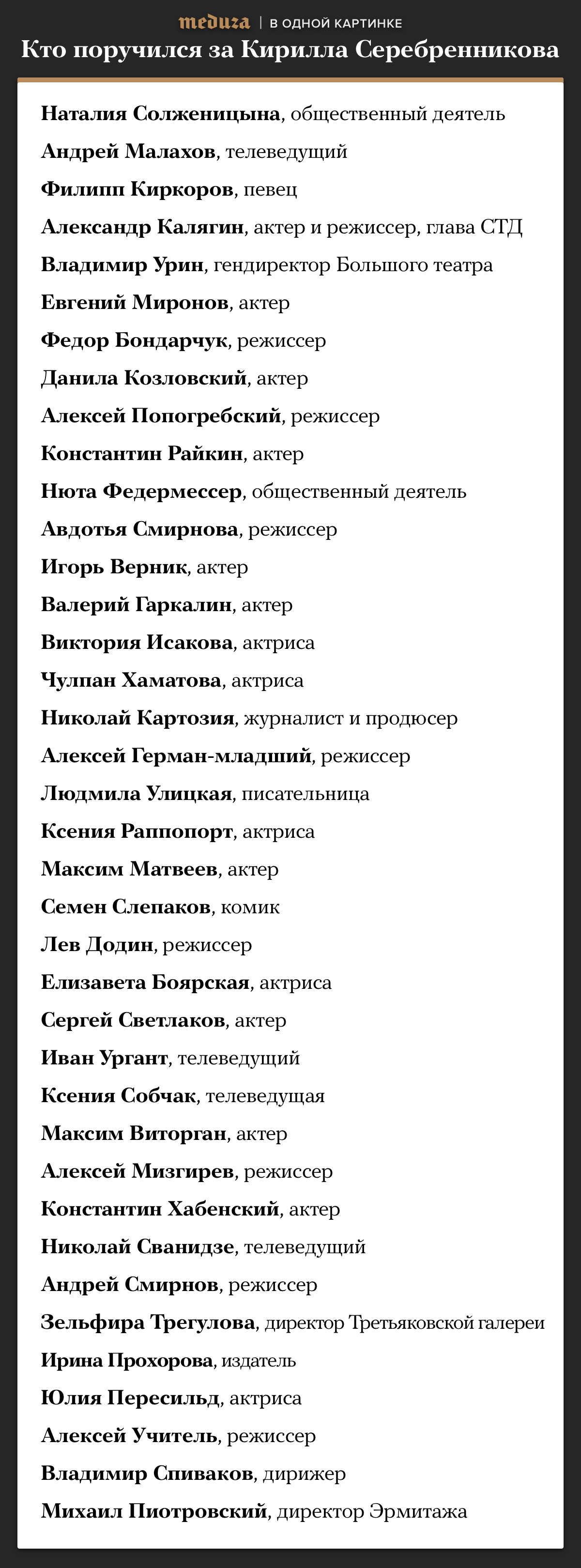 23 августа режиссера Кирилла Серебренникова доставили в Басманный суд, чтобы решить вопрос о мере пресечения. Его обвиняют в хищении 68 миллионов рублей. За Серебренникова поручились 38 человек, среди которых известные актеры, режиссеры, журналисты и общественные деятели.