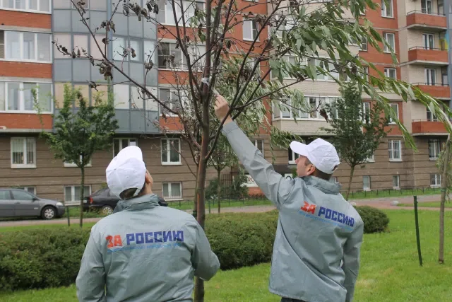 Представители правительства Санкт-Петербурга для проверки съездили в сад Ткачей в Невском районе, где сотрудники коммунальных служб скотчем приклеивали зелёные ветки к засохшим деревьям.